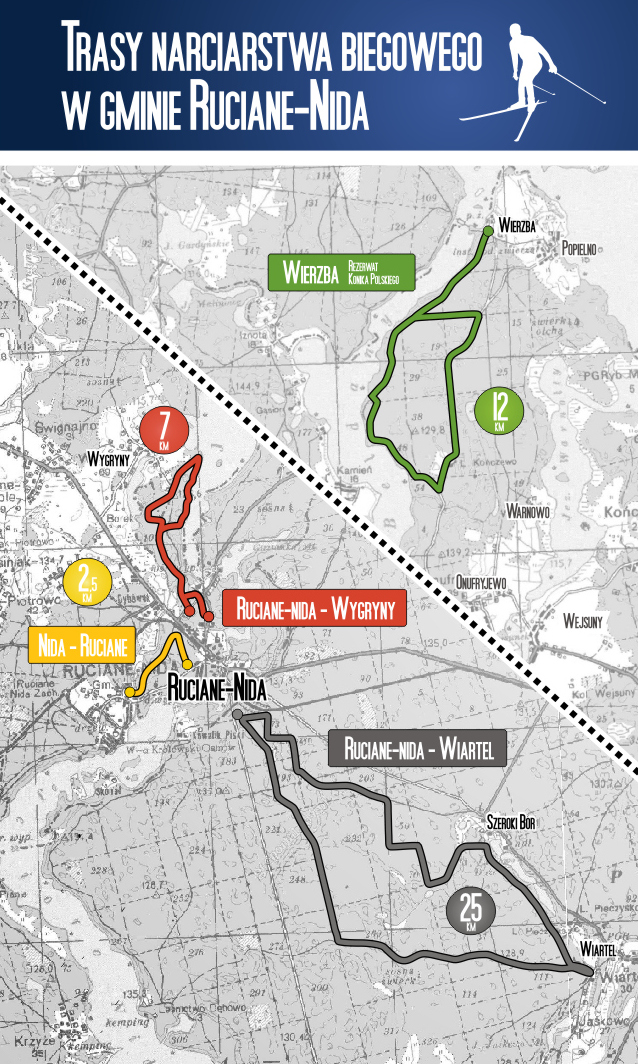 Najdłuższa i najtrudniejsza z tras biegowych. Pętla rozpoczyna się oboku Hotelu Nidzkiego przy ul. Nadbrzeżnej w Rucianem-Nidzie. Na trasie znajdują sie miejscowości Szeroki Bór i Wiartel.